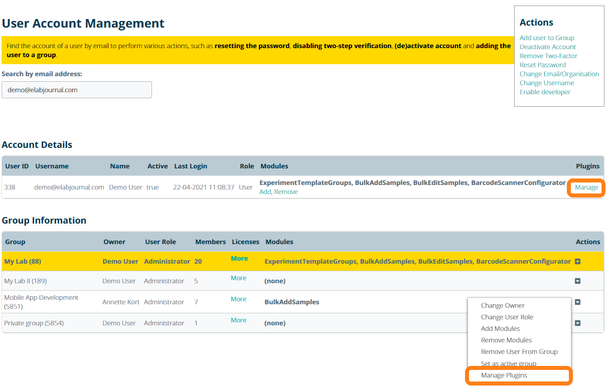To activate a custom plug-in in your eLabInventory Private Cloud or On-Premise installation, navigate to Accounts in the System Admin panel and open Manage Accounts. Find the user by the email address. Click on Manage in the Account Details table of the user to install an SDK plug-in for a user. To install a plug-in for a all users in a group, you can choose the Add Modules options in the actions submenu of the Group Information Table. Note that prior to activation of a plug-in, the plug-in needs to be installed. Installation of an SDK plug-in is currently handled by Bio-ITech.
