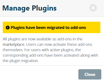 Important Notice: All Plug-ins have been migrated and renamed to add-ons. All plug-ins have been migrated and renamed to add-ons and are now available in the Marketplace. Activation can now be done the user by installing it from the Marketplace.