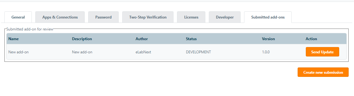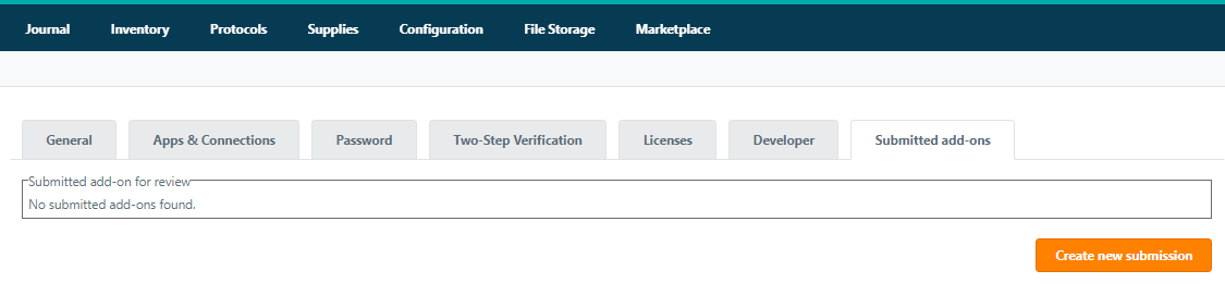 Navigate to the Plugin Submission tab in My Account and click Create new Submission. Make sure to the developer mode is enabled to access the Plug-in Submissions tab.