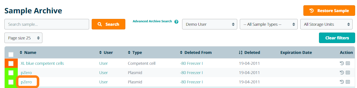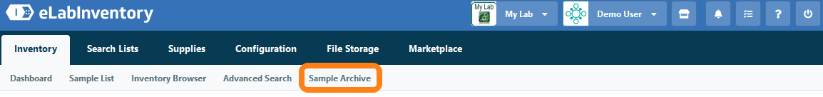 Samples that have been removed from the lab inventory are stored to the Sample Archive. Navigate to Sample Archive under the Inventory tab to view all samples that were previously stored in the lab's inventory. This ensures that any information about archived sample that might be linked in experiments will remain available.