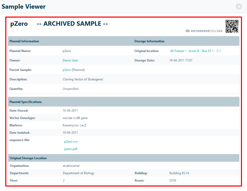 The sample information sheet in the pop-up window displays the information for the stored sample, including any experiments where the samples were linked.