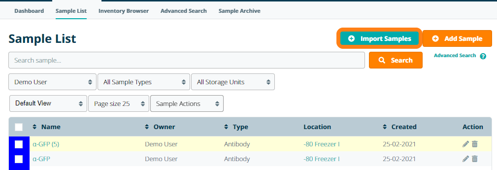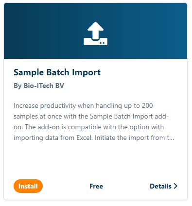 After installation of the Sample Batch Import add-on, navigate to Sample List in the inventory tab. The option to Import Samples is now available in the Sample List.