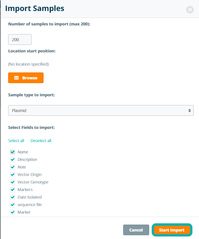 To import samples in multiple locations select multiple locations, all samples will be imported in the chosen compartment orientation.