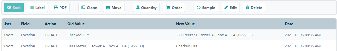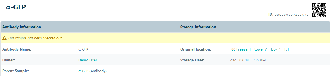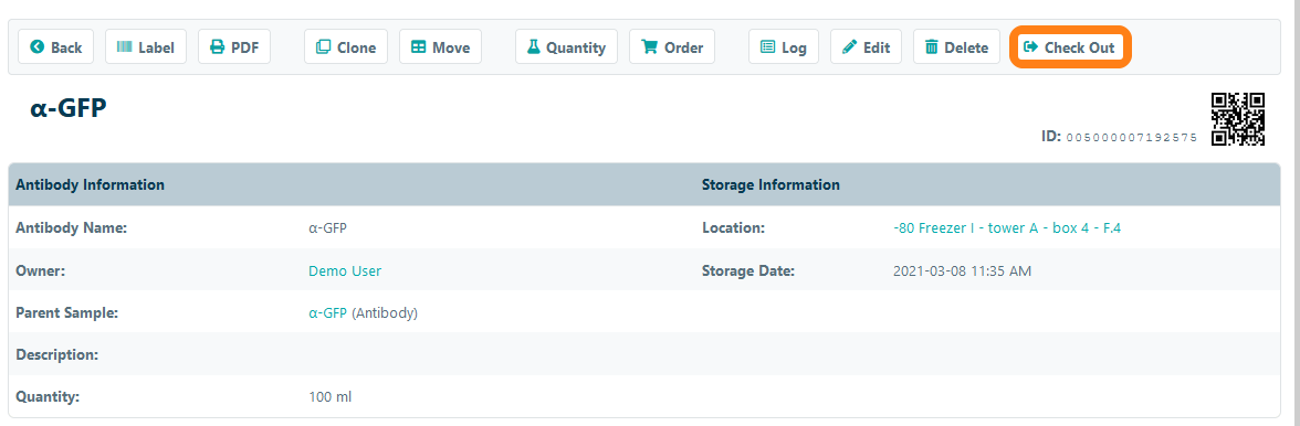 Enable to check-out and check-in of a sample from a storage location in eLabInventory. You can install the free Sample Check-out add-on from the Marketplace.