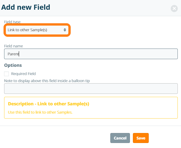 To add a field in which you can link samples, choose Link to other Sample(s) from the Field type dropdown.