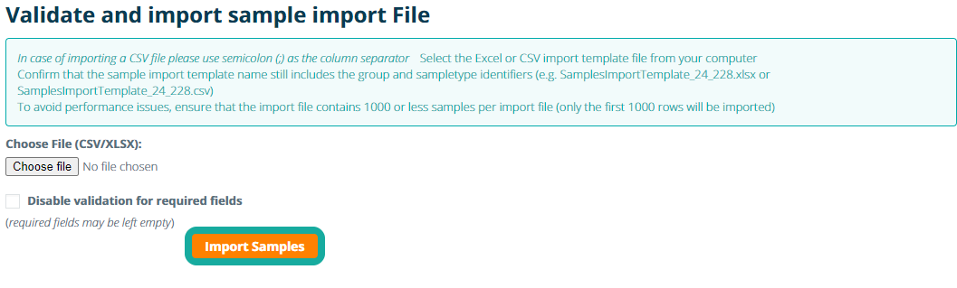 - The name of the sample import template must be contained in the imported file. It is allowed add additional info using only letters in the file name (e.g. the file name should be SamplesImportTemplate_24_228.xlsx or SamplesImportTemplate_24_228.csv)