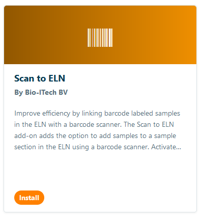 Improve efficiency by linking barcode labeled samples in the ELN with a barcode scanner. The Scan to ELN add-on adds the option to add samples to a sample section in the ELN using a barcode scanner. Activate the add-on and scan barcodes of samples or sample series to link them in the ELN sample sections. The add-on is also compatible with linked external barcodes to samples. You can download the free Scan to ELN add-on from our Marketplace.
