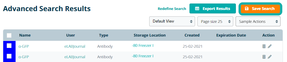 Advanced sample searches that need to be performed on a regular basis can be saved in the Search List for easy access. After performing an advanced search, click Save Search to add the search criteria as an entry in the Search List.