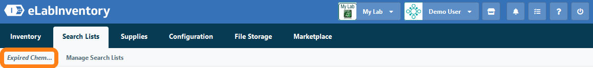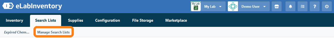 The Search Lists tab will become available in the toolbar to the user's saved searches. Click on a shortcut to run a search of the inventory with the saved search criteria.