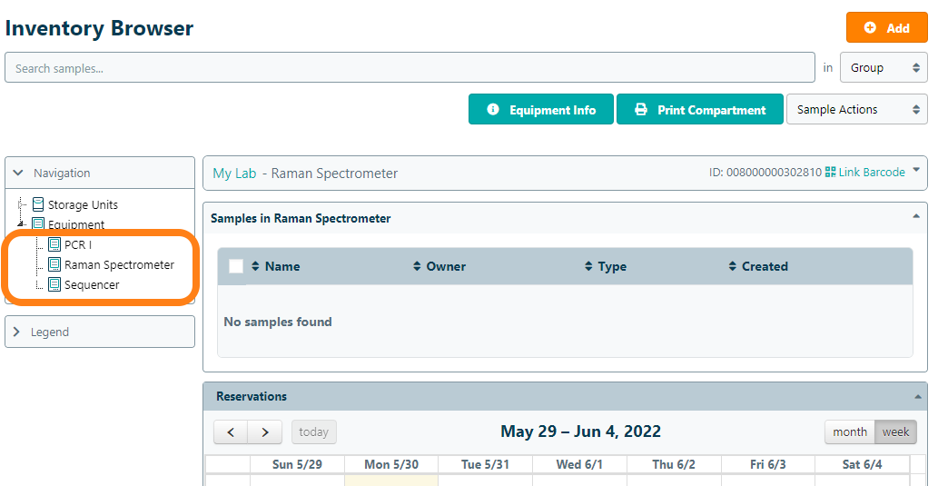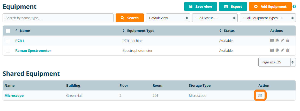 You further manage shared equipment via Configuration – Equipment. Here you can perform standard actions like booking a device for an experiment as well as removing shared equipment from your lab inventory.