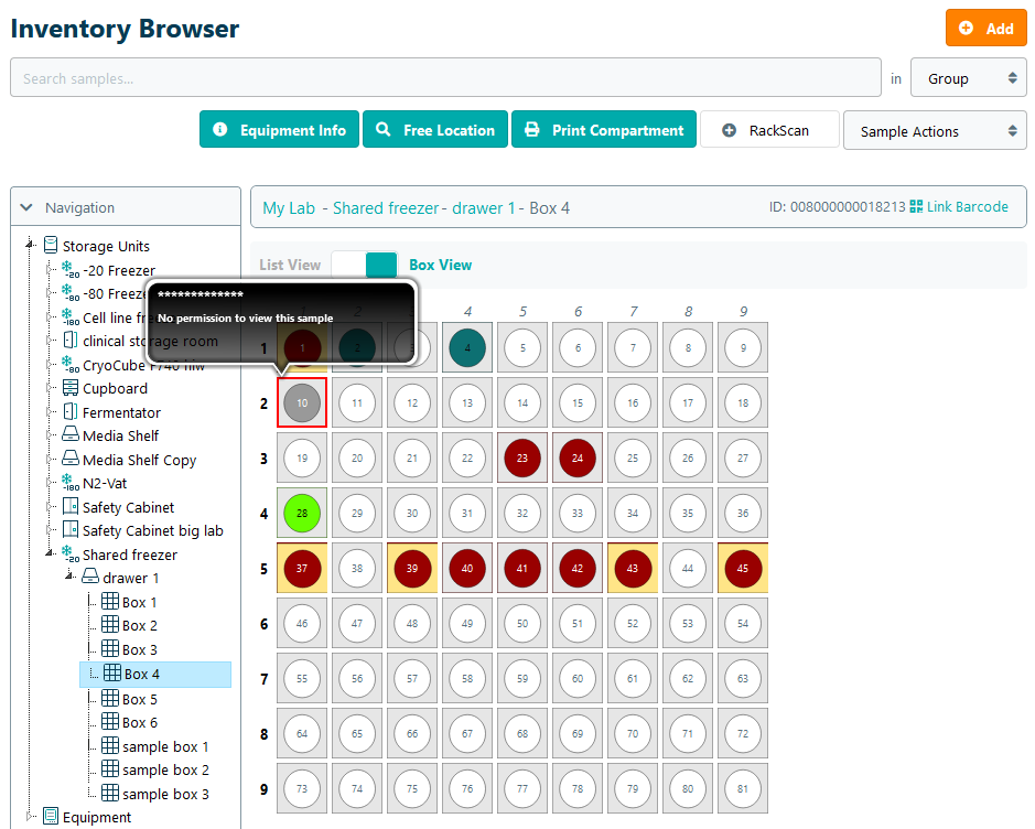 All samples stored by other labs in this storage unit or any of its compartments are anonymized and cannot be viewed by people in other labs. By sharing storage units, you can set up centralized locations for sample storage for multiple labs in an organisation to make them all accessible for different labs without disclosing information about the actual content. Note that if you are a member of multiple labs in which the storage unit is shared, you can change the active lab to access information about the other samples stored in the lab.