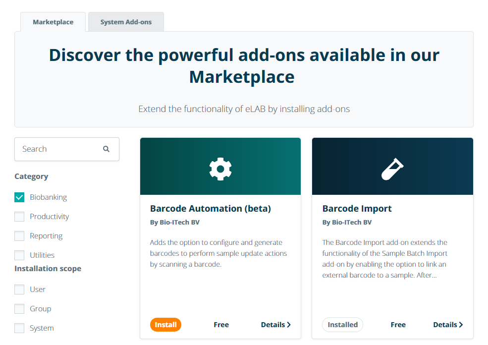 Installing a system add-on makes the functionality of the add-on available for all users in the system. Users will not be able to uninstall this add-ons. Once an add-on is installed on the system it appears under installed tab in the Marketplace.