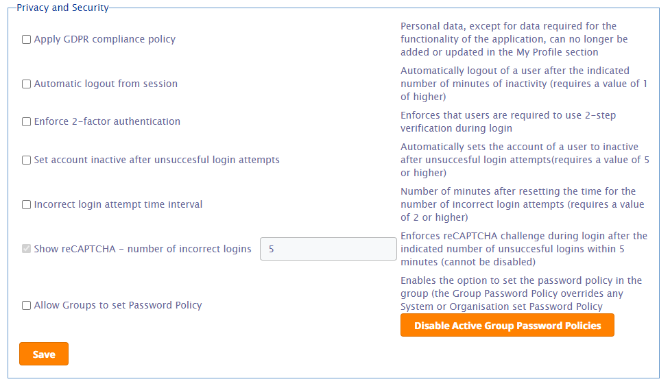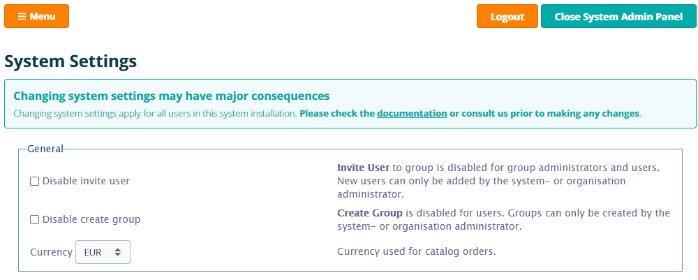 - Disable create group - disables the create group option for users in the system. Groups can only be created by the System Administrator or the Organisation Administrator.