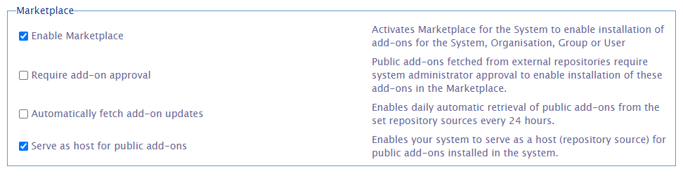 - Enable Marketplace - Activates the Marketplace and allows users to install Public and Private add-ons as available in the Marketplace.