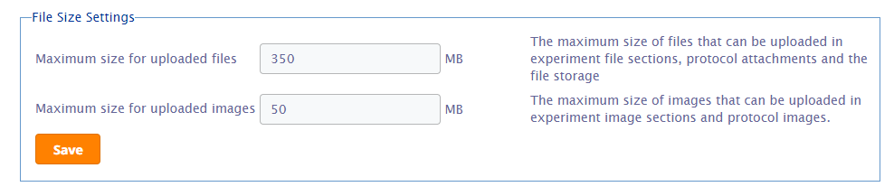 - Maximum size for uploaded files - the maximum size of any file that can be uploaded in an experiment file section or as a protocol attachment.