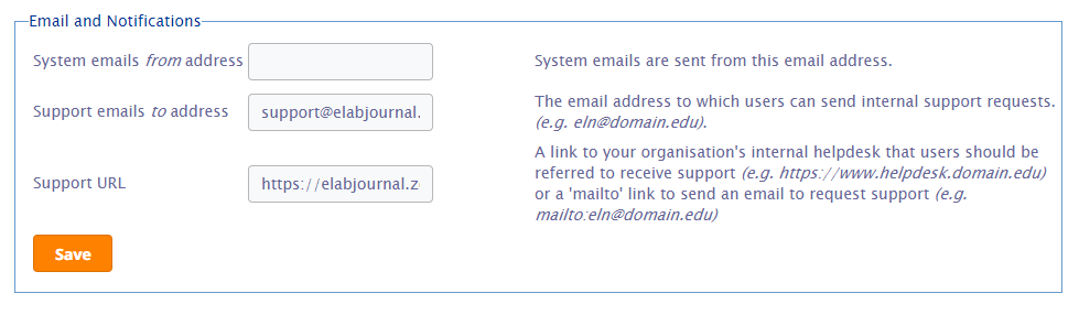 - Support URL - the address of the organisation internal help desk. If your organisation does not have a help desk a "mailto" link can also added. For example mailto:support@elabjournal.com