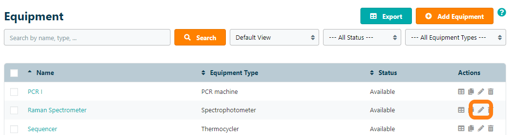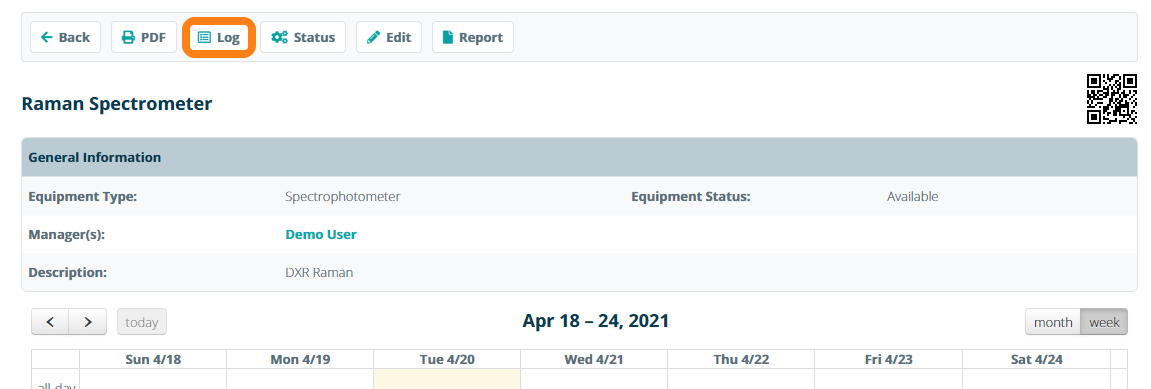 All changes to a device in equipment are being logged in the equipment log. To go to the equipment log by clicking on Log.
