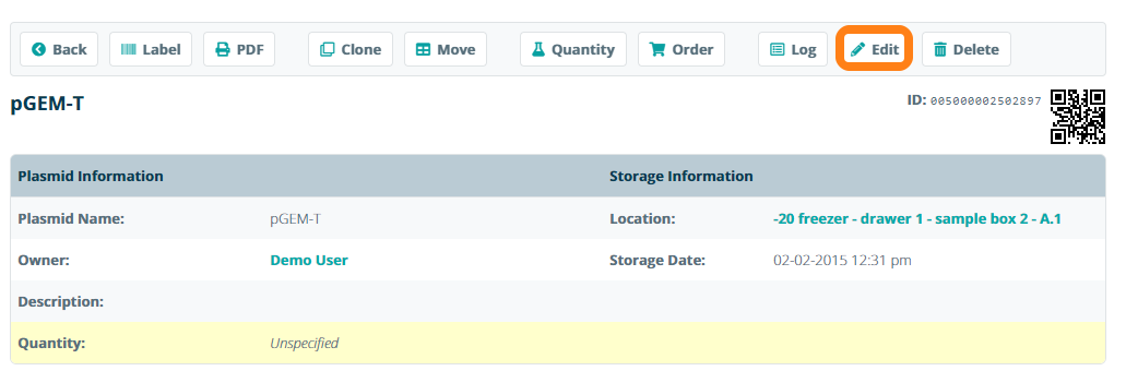 To update a sample's information, open the sample information sheet and click Edit.
