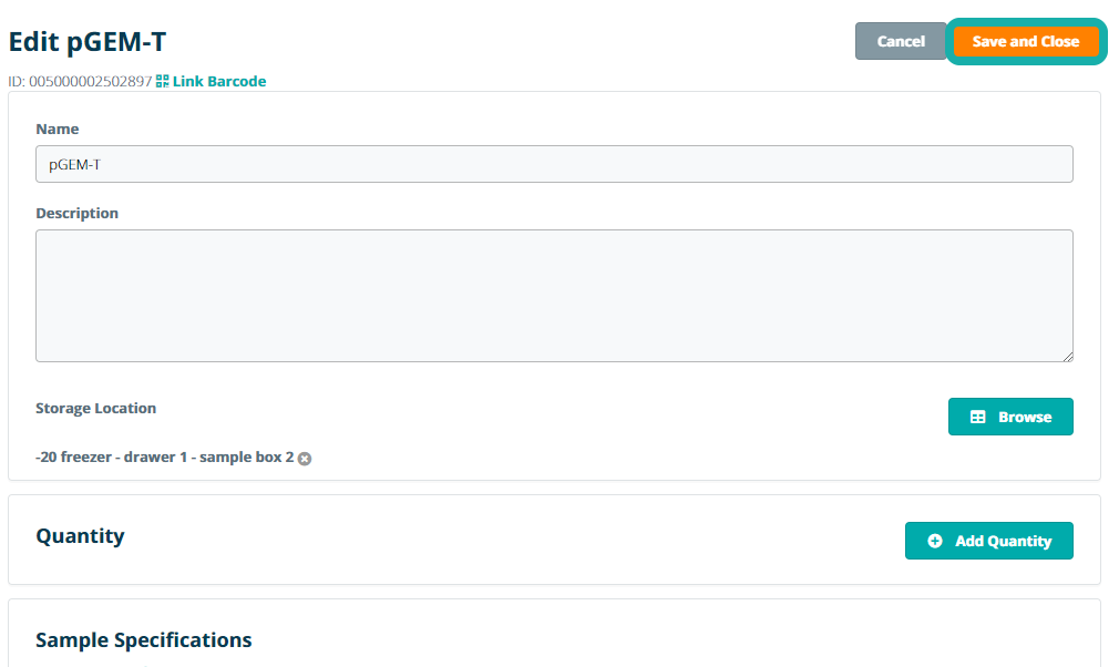 In the sample edit view, you can change the information in all standard fields and the sample specification fields. You can also add a note, move a sample to a different location, or set or change the sample quantity (only available if the Supplies module is active). After changing the relevant sample information, click Save and Close to store the updated sample information. Note that all changes to sample information are logged in the sample log, according to GLP compliance.