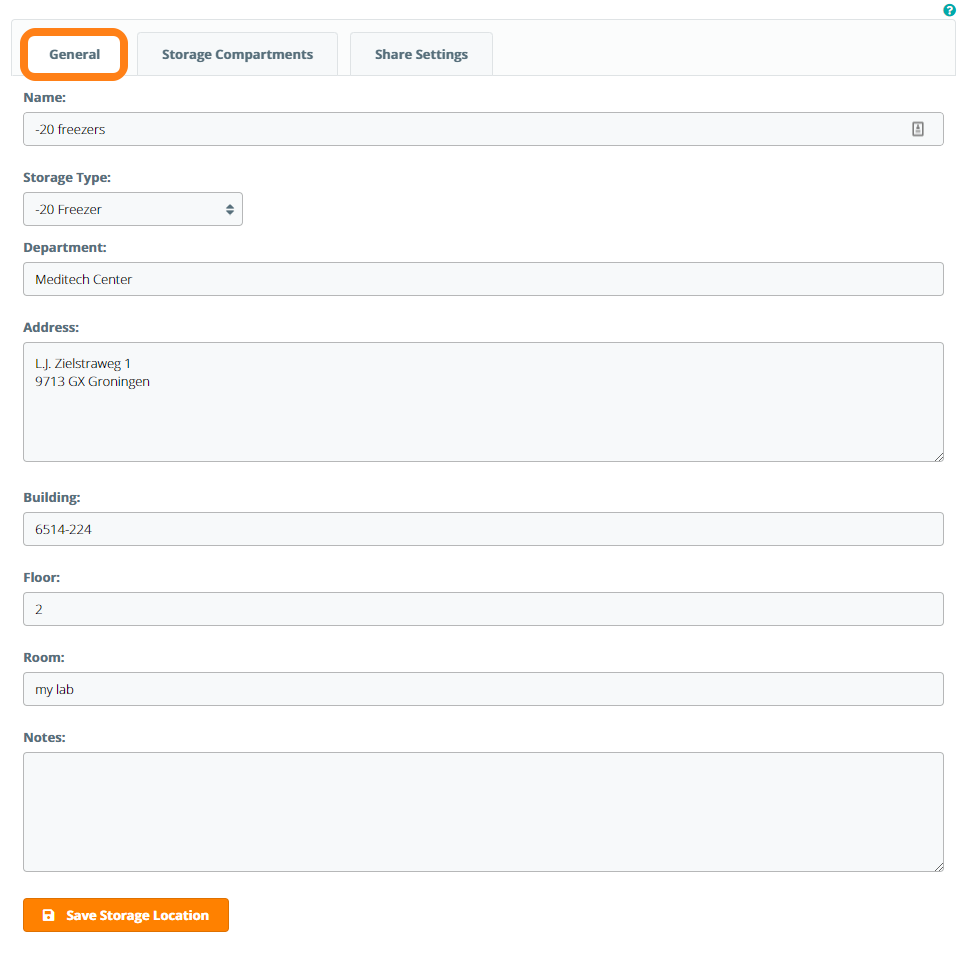 In the General tab, you can change the storage unit name, storage type and all relevant location information like department, building, floor and room.