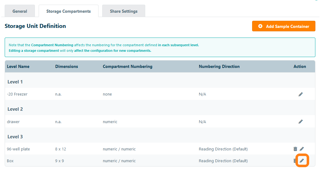 In the Storage Compartments tab you can alter the configuration of the template for the type of compartments set up for storage unit including the default naming, numbering and size. Click on edit to modify the compartment configuration.