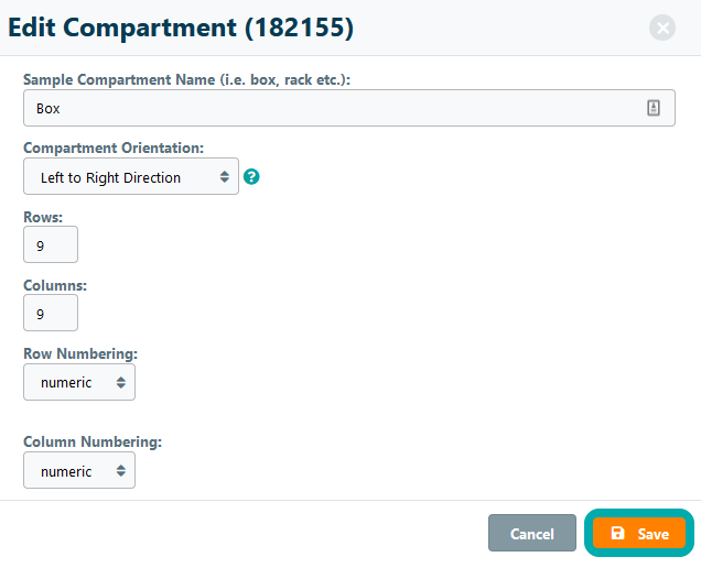 Change the compartment name and numbering of the compartment. If you edit a compartment with a grid (i.e. a box or 96-wells plate), you can also change the grid size and the position numbering of the wells.