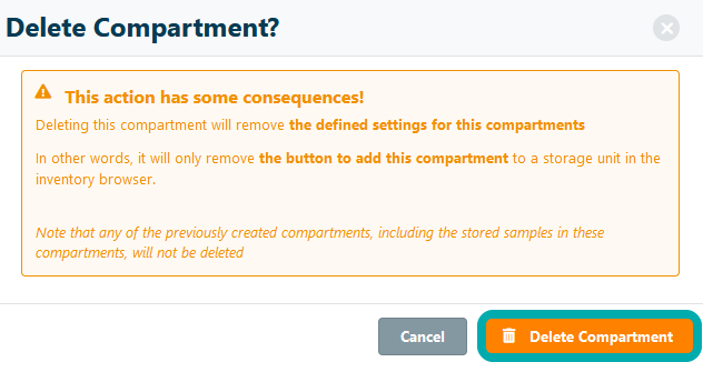 Besides changing the configuration of the compartments, you can also remove the compartment template if it should no longer be added any more to the storage unit. Also when removing a compartment here, it will not affect or delete any of the existing compartments. It will only remove the option in the inventory browser to add this type of compartment.