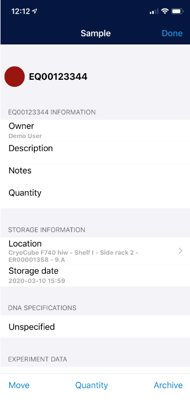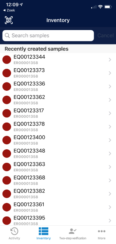 Mobile AppInventory View Sample The inventory gives an overview of the recently added samples. In the inventory offers the option to search samples or view sample information after scanning their barcode. Click on the sample to open it