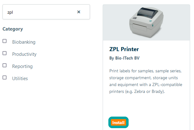 To enable printing of barcode labels with a Zebra© or other ZPL-compatible printer in eLabInventory, confirm that the printer is capable of processing ZPL code (i.e. .zpl label template files) and install the ZPL Printer add-on from the Marketplace.