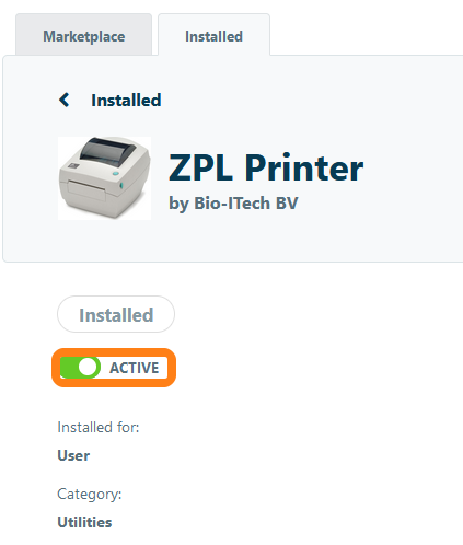 If you successfully printed a label, your printer has been correctly set-up and you can activate the ZPL Printer add-on for your eLabInventory account. Make sure that under installed add-ons in the Marketplace the ZPL add-on is installed and active.